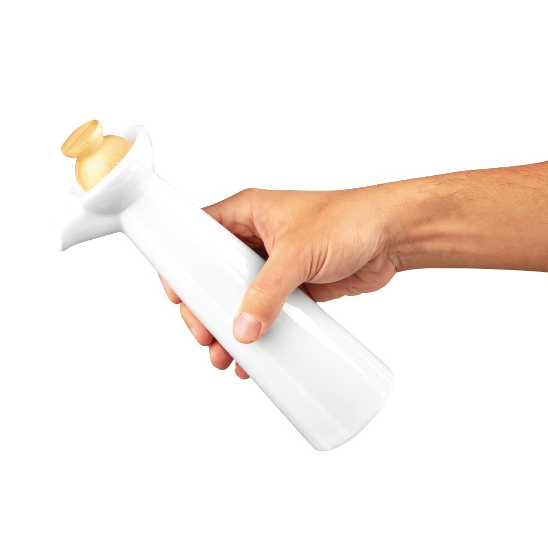 Looking for a simple but stylish way to serve oil or vinegar at the table? This bottle set from Olympia will blend in with any setting - the brilliant white porcelain is complemented perfectly by the natural wooden base that keeps the bottles secure and protects your table linen from drips or stains. The set includes a 165ml and 300ml bottle, each with their own attractive wooden stopper. The bottles themselves are incredibly strong too, easily coping with the demands of everyday use serving those essential condiments.
