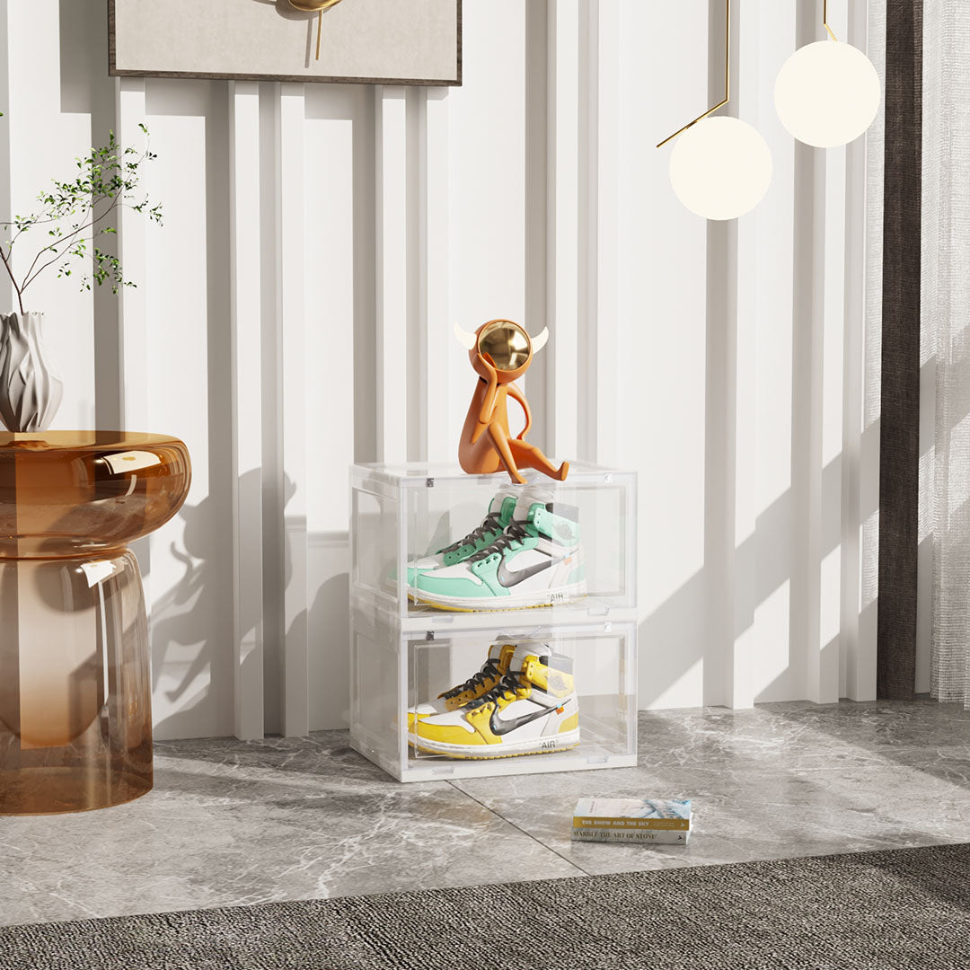- MAGNETIC DOOR AND VENTILATE DESIGN:This shoe box organiser containers are built with upgraded magnets, and its door has two upgraded magnets that provide suction when the door is closed. The ventilation design ensures constant fresh air exchange,effectively preventing odor.